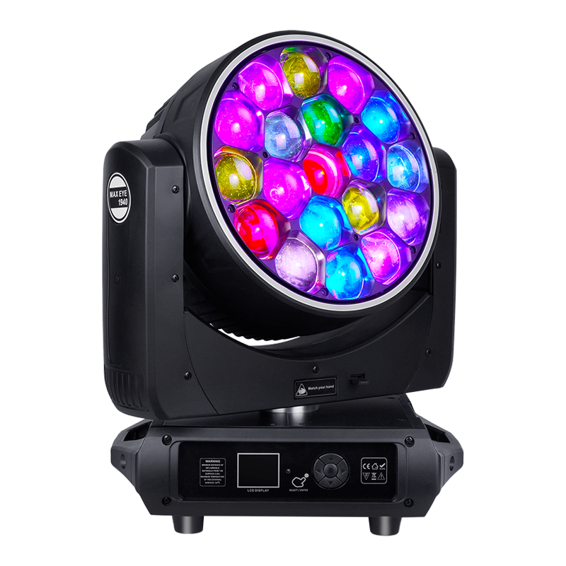 AL1940WZ, yakınlaştırma, kaleydoskop efektleri, halo halkası ve sonsuz lens dönüşüne sahip piksel kontrollü 19x40W Arı Gözü LED Hareketli Baş Işığıdır. Konserler, sahneler ve profesyonel şovlar için idealdir.